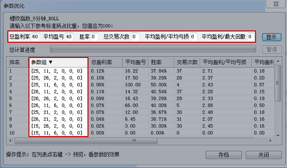 答:参考标准是用于投资者在参数优化后,根据个人的分析需求对各项指标按权重划分,对优选出的参数进行排序显示。权重数值大小根据个人偏好来设置,可以对关注度高的指标设置大一点的权重。比如,设置总盈利率权重为60,平均盈亏为40,优化后的参数组将按照总盈利率排名*60%+平均盈亏排名*40%的加权排名来排序显示。{来源 www.cxh99.com }