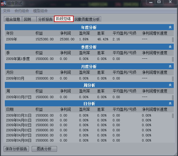 如下图,组合回测的阶段性分析报告,具体罗列组合在各个周期阶段的交易和收益情况,方便投资者统计账户交易情况,进行风控管理。