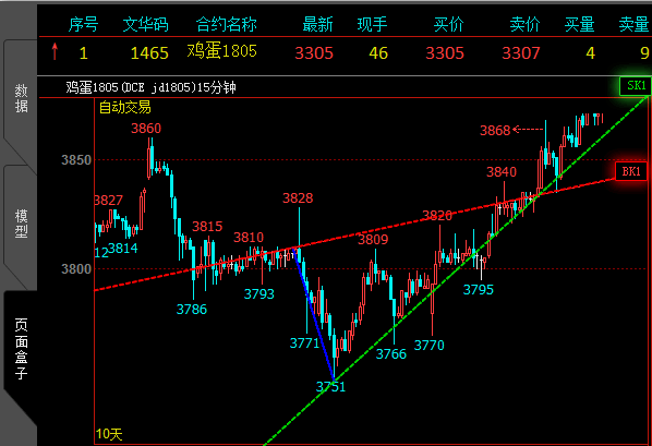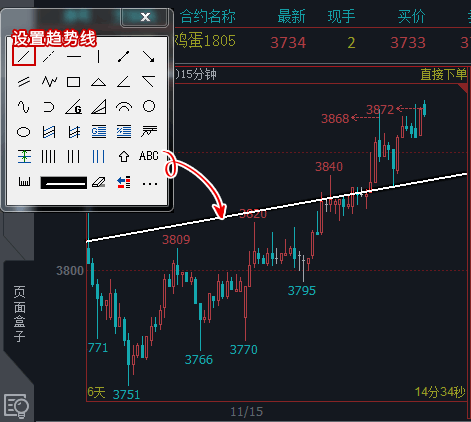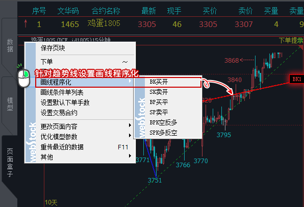 投资者根据自己长期看盘的经验判断趋势入场,但是程序化交易中有些形态是无法量化编写的。如下图,是一个非常明显的上升三角形调整形态,从本轮调整的压力点位来看,如果价格能够突破三角形的上边界,后市将迎来新一轮的强势上涨行情。我们对这条边设置画线程序化,当价格穿越斜线时买开做多,便可轻松解决无法量化编写的困难。