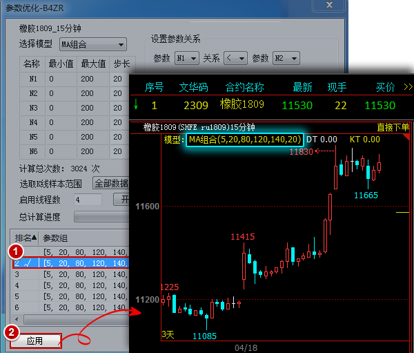 如下图,是在盒子中根据最新行情进行参数优化,选取适合当前行情的最佳参数。