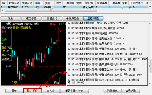 解决办法:可点击如图示“追对手价”按钮进行手动干预,撤掉原有的委托挂单,以当前的对手价重新发送委托(点击一次追一次),以此确保及时成交。