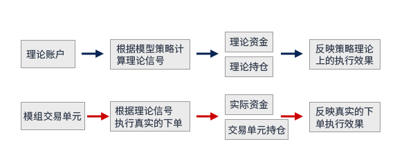 受制于市场流动性、期货撮合成交机制、网络速度等因素,程序化信号不可能100%按照模型里设定的价格方式完美成交。鉴于此,模组使用理论账户和交易单元,分别对理论上的信号和持仓,和信号执行的实际持仓,分别管理。