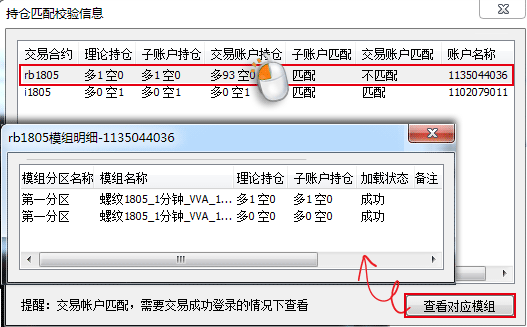 机构投资者运行模组数量较多,一个一个去检查账户持仓是否匹配需要的时间太长,软件提供智能的持仓匹配校验功能,一键查询真实账户持仓和程序化持仓是否匹配,同时可以查看模组是否正常加载以及加载失败的原因。
