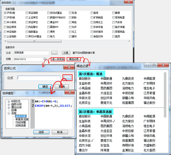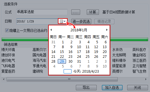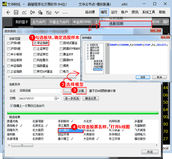 公式选股可以筛选出当前满足条件的合约,但是在历史K线中该公式是否依然有效呢?选股回测功能可以选出指定历史时间段中每天符合选股条件的股票,投资者可结合K线图查看逐日的股票明细,来检验选股公式的有效性。