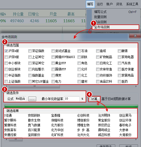 选股回测检验的是选股公式的效果,而全市场回测是使用一个完整的交易策略针对市场上的合约进行高速回测,检验交易模型的有效性,并根据收益率效果优选交易合约。
