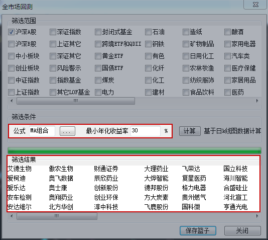 如下图,是以沪深A股合约为样本数据,筛选出MA金死叉策略收益率在30%以上的合约作为程序化备选合约。