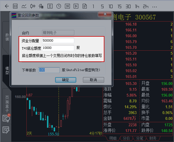 B.在单合约K线图上,根据实际情况填写股票的底仓额度、资金分配量等参数,如下图。