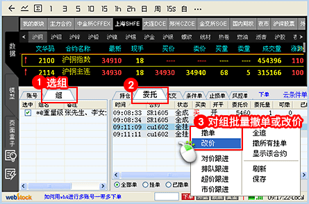 在左侧"组"列表中选择要操作的组,对组进行的委托,如果未成交,在委托列表单击鼠标右键->撤单/改价,可以对该组的未成交委托完成批量撤单或批量改价,不需要针对组中的合约进行一个一个撤单或改价的重复操作。