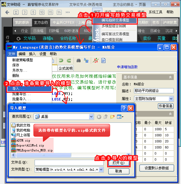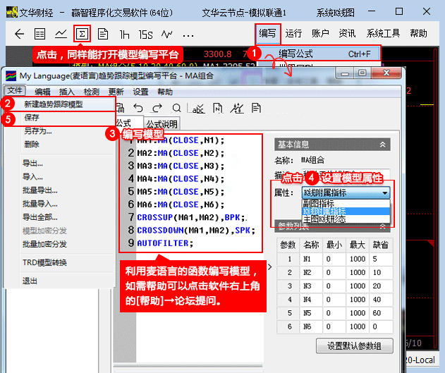 (4)模型编写完成后,进行语法检测,加载到主图并查看模型历史回测报告
