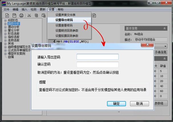 答:可以。在趋势交易模型编写平台中,点击【设置】—>【设置导出密码】进行加密。如下图所示是如何设置导出密码的。
