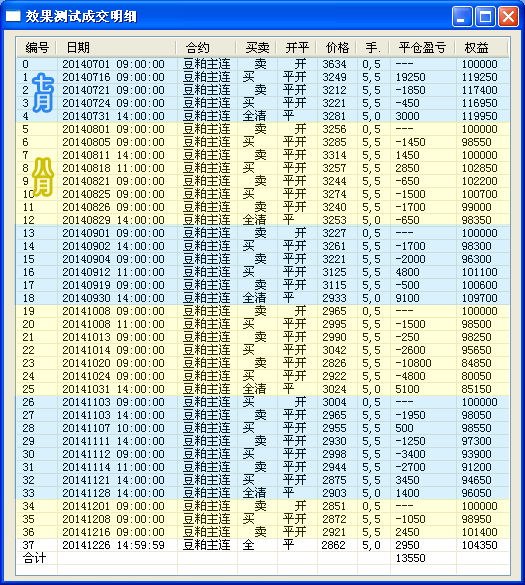 我们可以将上面编写好的源码加载到合约上进行回测,回测过程中软件会自动将每个交易阶段区分开来,在每月第一个交易日时重新初始化资金和信号,如下图所示,是回测报告的成交明细,通过该明细我们可以看出,每当新一月的交易日开始,权益都会变为我们所设定的100000。这样一来,及时是这种段落式交易的想法也可以实现历史数据回测了。( www.cxh99.com )