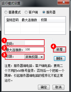点击菜单栏的【运行】—>【运行模式设置】,在弹出的设置框中按照下图的标号顺序设置服务器密码、最大连接数及权限,设置完成后点击确定。