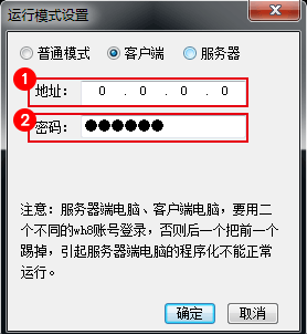 第二步:B电脑设置为客户端 点击菜单栏的【运行】—>【运行模式设置】,在弹出的设置框中输入A电脑的IP地址及在A电脑上设置的密码,设置完成后点击确定。