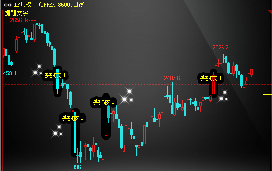 KTEXT(ABS(C-O)>MA(ABS(C-O),20)*3,0,H,1,COLORYELLOW,'突破!');//在长K线上标注黄色文字"突破!" www.cxh99.com