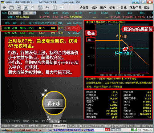 卖出看涨期权,获得权利金。当标的合约行情下跌,期权买方不会行权,这样可以获得权利金,如果行情上涨超过损益平衡点将会损失,上涨越多,损失越大。似卖出双色球(收益小,胜率高,一旦失败,损失不可预计)。当然也可以在行权前平仓,获得价差收益。"看不涨"策略中罗列出了符合此交易需求的期权合约(与此相反则是"看不跌"策略)。