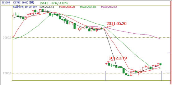 下图为if1305日k线图,合约在交割—挂牌(2011.5.20-2012.3.19)期间存在很大跳空,均线大幅度偏离k线趋势,均线指标失去了分析指导作用。