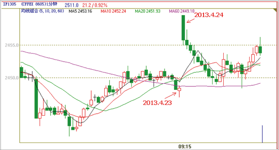 下图为if1305的1分钟k线图,在2013.4.24日开盘价和前一天的收盘价间存在很大跳空,均线受前一天k线数据影响,对开盘的做空趋势反应迟钝。
