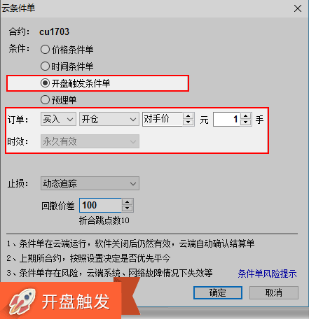 如下图,设置开盘触发条件单,系统会在开盘瞬间自动发出委托,远远大于人脑的反应速度和操作速度,能够让委托在更有利的价位成交。 www.cxh99.com