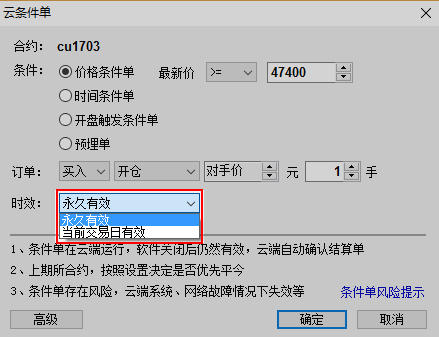 答:“永久有效”:设置为永久有效条件单,会自动确认结算单,不需要每天手动确认结算单,条件单一直有效,直至触发。 “当前交易日有效”:当日有效是指当前交易日条件单有效,对于有夜盘的合约,当前交易日是指前一天的夜盘时间+当天的白盘交易时间。(来源 程序化久久 )