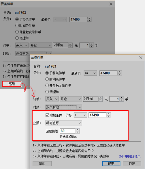6、条件单满足条件时是否弹出提示框,手动点确认后在下单?