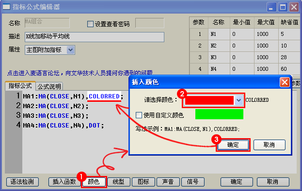 颜色修改:打开指标源码,将MA1:MA(CLOSE,N1);修改为MA1:MA(CLOSE,N1),COLORRED;则MA1会显 示为红色,其他均线同样修改,如果您不知道颜色代码,点击例如下图所示①~③,可以在源码处自动插入颜色代码。