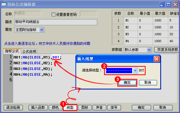 线形修改:打开指标源码,将MA1:MA(CLOSE,N1);修改为MA1:MA(CLOSE,N1),DOT;则MA1会显示为虚线,其他均线同样修改,如果您不知道线形代码,点击例如下图所示①~③,可以在源码处自动插入线性代码。( www.cxh99.com )