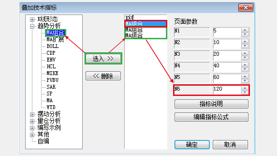 6条均线:在k线图上点击鼠标右键->叠加分析指标,弹出例如下图所示窗口,点击红框中的“MA组合”,修改右侧N6值,即可显示6条均线。更多均线:例如下图绿框所示,左侧栏的任一指标可以多次选入到右侧栏,每选入一次“MA组合”就会在图表上多增加 6条均线,同样在右侧修改N1-N6的值。