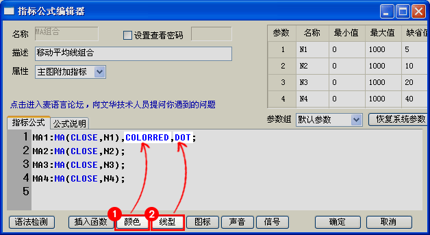 颜色、线形同时修改:打开指标源码,将MA1:MA(CLOSE,N1);修改为MA1:MA(CLOSE,N1),COLORRED,DOT;则 MA1会显示为红色虚线,其他均线同样修改,颜色、线形代码可通过下列① ②处设置。