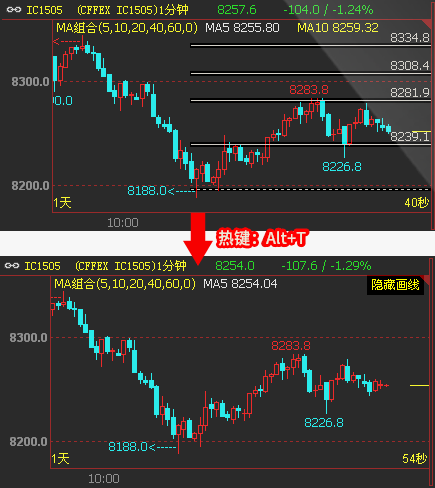 在k线图表上单击鼠标右键->【更多】->【临时隐藏手工画线】;也可以使用热键Alt+T。