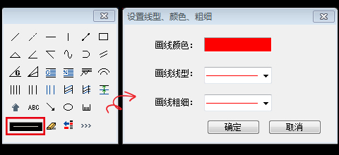 在图表上点击鼠标右键->画线,调出画单工具箱后,点击下图中红框位置,在弹出的窗口中设置画线的颜色、线型。