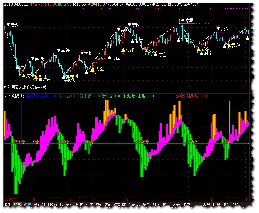 PL5:=ZIG(3,5); EN1:=ZIG(3,5)>REF(ZIG(3,5),1) AND REF(ZIG(3,5),1)<=REF(ZIG(3,5),2) AND REF(ZIG(3,5),2)<=REF(ZIG(3,5),3); EX1:=ZIG(3,5)<REF(ZIG(3,5),1) AND REF(ZIG(3,5),1)>=REF(ZIG(3,5),2) AND REF(ZIG(3,5),2)>=REF(ZIG(3,5),3); PL10:=ZIG(3,13); EN2:=ZIG(3,10)>REF(ZIG(3,10),1) AND REF(ZIG(3,10),1)<=REF(ZIG(3,10),2) AND REF(ZIG(3,10),2)<=REF(ZIG(3,10),3); EX2:=ZIG(3,10)<REF(ZIG(3,10),1) AND REF(ZIG(3,10),1)>=REF(ZIG(3,10),2) AND REF(ZIG(3,10),2)>=REF(ZIG(3,10),3); PL20:=ZIG(3,26); EN3:=ZIG(3,20)>REF(ZIG(3,20),1) AND REF(ZIG(3,20),1)<=REF(ZIG(3,20),2) AND REF(ZIG(3,20),2)<=REF(ZIG(3,20),3); EX3:=ZIG(3,20)<REF(ZIG(3,20),1) AND REF(ZIG(3,20),1)>=REF(ZIG(3,20),2) AND REF(ZIG(3,20),2)>=REF(ZIG(3,20),3); PL40:=ZIG(3,55); 走强一:=BARSLAST(PL5<REF(PL5,1)); 走弱一:=BARSLAST(PL5>REF(PL5,1)); 走强二 :=BARSLAST(PL10<REF(PL10,1)); 走弱二:=BARSLAST(PL10>REF(PL10,1)); 走强三:=BARSLAST(PL20<REF(PL20,1)); 走弱三:=BARSLAST(PL20>REF(PL20,1)); ZTJZ5:=IF(PL10>REF(PL10,1),COUNT(EN1,走强二 ),0); ZTJD5:=IF(PL10>REF(PL10,1),COUNT(EX1,走强二 ),0); DTJZ5:=IF(PL10<REF(PL10,1),COUNT(EN1,走弱二),0); DTJD5:=IF(PL10<REF(PL10,1),COUNT(EX1,走弱二),0); ZTJZ10:=IF(PL20>REF(PL20,1),COUNT(EN2,走强三),0); ZTJD10:=IF(PL20>REF(PL20,1),COUNT(EX2,走强三),0); DTJZ10:=IF(PL20<REF(PL20,1),COUNT(EN2,走弱三),0); DTJD10:=IF(PL20<REF(PL20,1),COUNT(EX2,走弱三),0); DRAWTEXT(EN1 AND DTJZ5=1,LOW*0.98,'(Ⅰ)'),COLORFFFF00; DRAWTEXT(EX1 AND DTJD5=2,HIGH*1.02,'(Ⅱ)'),COLORFFFF00; DRAWTEXT(EN2 AND ZTJZ5=1,LOW*0.98,'(Ⅲ)'),COLORFFFF00; DRAWTEXT(EX1 AND PL10>REF(PL10,1) AND ZTJD5=1,HIGH*1.02,'⑴'),COLOR0000FF; DRAWTEXT(EN1 AND PL10>REF(PL10,1) AND ZTJZ5=2,LOW*0.98,'⑵'),COLOR0000FF; DRAWTEXT(EX1 AND PL10>REF(PL10,1) AND ZTJZ5=2,HIGH*1.02,'⑶'),COLOR0000FF; DRAWTEXT(EN1 AND PL10>REF(PL10,1) AND ZTJZ5=3,LOW*0.98,'⑷'),COLOR0000FF; DRAWTEXT(EX2 AND PL20>REF(PL20,1) AND ZTJD10=1,HIGH*1.02,'⑸'),COLOR0000FF; DRAWTEXT(EN2 AND DTJZ10=1,LOW*0.94,'【A】'),COLOR00FF00; DRAWTEXT(EX2 AND DTJD10=2,HIGH*1.03,'【B】'),COLOR00FF00; DRAWTEXT(EN3 AND ZTJZ10=1,LOW*0.94,'【C】'),COLOR00FF00; DRAWTEXT(EX2 AND PL20>REF(PL20,1) AND ZTJD10=1,HIGH*1.04,'①'),LINETHICK3,COLOR00FFFF; DRAWTEXT(EN2 AND PL20>REF(PL20,1) AND ZTJZ10=2,LOW*0.94,'②'),LINETHICK3,COLOR00FFFF; DRAWTEXT(EX2 AND PL20>REF(PL20,1) AND ZTJD10=2 OR (ZTJD10=0 OR ZTJD10=2) AND EX2,HIGH*1.04,'③'),LINETHICK3,COLOR00FFFF; DRAWTEXT(EN2 AND PL20>REF(PL20,1) AND ZTJZ10=3,LOW*0.94,'④'),LINETHICK3,COLOR00FFFF; DMLJ:=HHV(HIGH,120); TY:=CLOSE; HD:=FILTER(BACKSET(FILTER(REF(TY,10)=HHV(TY,2*10+1),10),10+1),10); LD:=FILTER(BACKSET(FILTER(REF(TY,10)=LLV(TY,2*10+1),10),10+1),10); A:=REF(CLOSE,BARSLAST(HD)); B:=REF(CLOSE,BARSLAST(LD)); T1:=BARSLAST(HD)<BARSLAST(LD) AND NOT(HD) ; T2:=BARSLAST(HD)>BARSLAST(LD) AND NOT(LD); 波浪顶:IF(T1,A,A),COLORFF00FF,POINTDOT,LINETHICK2; STICKLINE(T1,A,A,9,0),COLORFF00FF; 波浪底:IF(T2,B,B),COLOR80FF00,POINTDOT,LINETHICK2; VAR3:=LLV(HIGH,240); VAR4:=100*(CLOSE-VAR3)/VAR3; VAR5:=(CLOSE-LLV(LOW,528))/(HHV(HIGH,528)-LLV(LOW,528))*100; VAR6:=(CLOSE-LLV(CLOSE,530))/(HHV(CLOSE,530)-LLV(CLOSE,530))*100; VAR7:=0; VAR8:=MA(HHV(CLOSE-REF(CLOSE,1),0),34)/MA(ABS(CLOSE-REF(CLOSE,1)),7)*100; VAR9:=MA(HHV(CLOSE-REF(CLOSE,1),0),13)/MA(ABS(CLOSE-REF(CLOSE,1)),13)*100; VARA:=BARSCOUNT(CLOSE); VARB:=VAR8<20 AND VAR9<23 AND VARA>35; VARC:=VARB AND COUNT(VARB,1)=1; VARD:=EMA(CLOSE,21)-EMA(CLOSE,8); VARE:=EMA(VARD,5); VARF:=TROUGH(3,6,1)<4 AND CROSS(VARD,VARE); VAR10:=IF(TROUGH(3,16,1)=0 AND HIGH>LOW+0.04,4,0); VAR11:=ZIG(3,6)>REF(ZIG(3,6),1) AND REF(ZIG(3,6),1)<=REF(ZIG(3,6),2) AND REF(ZIG(3,6),2)<=REF(ZIG(3,6),3); VAR12:=ZIG(3,6)<REF(ZIG(3,6),1) AND REF(ZIG(3,6),1)>=REF(ZIG(3,6),2) AND REF(ZIG(3,6),2)>=REF(ZIG(3,6),3); VAR13:=ZIG(3,22)>REF(ZIG(3,22),1) AND REF(ZIG(3,22),1)<=REF(ZIG(3,22),2) AND REF(ZIG(3,22),2)<=REF(ZIG(3,22),3); VAR14:=ZIG(3,22)<REF(ZIG(3,22),1) AND REF(ZIG(3,22),1)>=REF(ZIG(3,22),2) AND REF(ZIG(3,22),2)>=REF(ZIG(3,22),3); VAR15:=ZIG(3,51)>REF(ZIG(3,51),1) AND REF(ZIG(3,51),1)<=REF(ZIG(3,51),2) AND REF(ZIG(3,51),2)<=REF(ZIG(3,51),3); VAR16:=ZIG(3,51)<REF(ZIG(3,51),1) AND REF(ZIG(3,51),1)>=REF(ZIG(3,51),2) AND REF(ZIG(3,51),2)>=REF(ZIG(3,51),3); VAR17:=ZIG(3,72)>REF(ZIG(3,72),1) AND REF(ZIG(3,72),1)<=REF(ZIG(3,72),2) AND REF(ZIG(3,72),2)<=REF(ZIG(3,72),3); VAR18:=ZIG(3,72)<REF(ZIG(3,72),1) AND REF(ZIG(3,72),1)>=REF(ZIG(3,72),2) AND REF(ZIG(3,72),2)>=REF(ZIG(3,72),3); VAR19:=EMA(CLOSE,2)-EMA(CLOSE,150); VAR1A:=EMA(VAR19,100); VAR1B:=2*(VAR19-VAR1A); VAR1C:=POW(VAR1B,3)*0.1+POW(VAR1B,1); VAR1D:=SQRT(SQRT(LOW*HIGH*OPEN*CLOSE)); VAR1E:=EMA(VAR1D*0.97,3); VAR1F:=(HIGH+LOW+CLOSE)/3; VAR20:=(VAR1F-MA(VAR1F,14))/(0.015*AVEDEV(VAR1F,14)); VAR21:=CROSS(VAR1E,LOW); 买点一:=VAR10; 买点二:=(VAR11+VAR13+VAR15+VAR17); 卖点一:=(VAR12+VAR14+VAR16+VAR18); VAR22:=买点一 AND VARF AND VARC AND VAR21 AND VAR4<0 AND VAR5=0 AND VAR6=0 AND VAR20<(-110); VAR1:=MA(CLOSE,6); VAR2:=MA(CLOSE,18); VAR31:=MA(CLOSE,30); VARB1:=SUM(CLOSE*VOL*100,28)/SUM(VOL*100,28); VARC1:=INTPART(VARB1*100)/100; VARD1:=EMA(CLOSE,5)-EMA(CLOSE,10); VARE1:=EMA(VARD1,9); VAR131:=REF(VARE1,1); VAR141:=VARE1; VAR151:=VAR141-VAR131; VAR161:=REF(VARD1,1); VAR171:=VARD1; VAR181:=VAR171-VAR161; VAR191:=OPEN; VAR1A1:=CLOSE; DRAWTEXT(买点一>0,LOW-0.01,'▲买!'),COLORRED; DRAWTEXT(买点二>0,LOW-0.01,'▲买涨'),COLORYELLOW; DRAWTEXT(卖点一>0,HIGH+0.1,'▼卖跌'), COLORWHITE; A1:=BARSCOUNT(CLOSE); AH:=HHV(HIGH,72); AL:=LLV(LOW,72); A0:=(AH-AL)/21; B1:=LOW-A0; DRAWTEXT((A1+0)/15=FLOOR((A1+0)/15),B1-2.5*A0,'▲时窗'),COLORWHITE; VAR51:=HHVBARS(ZIG(3, 19)>REF(ZIG(3,19),1) AND REF(ZIG(3,19), 1)<REF(ZIG(3,19), 2),0); STICKLINE(VAR51=2,LOW*0.95,LOW*0.98,8,0),COLOR0000FF; DRAWTEXT(VAR51=2,LOW*0.95,'3天'),COLORWHITE; STICKLINE(VAR51=4,HIGH*1.05,HIGH*1.02,8,0),COLOR9966FF; DRAWTEXT(VAR51=4,HIGH*1.06,'5天'),COLORWHITE; STICKLINE(VAR51=7,LOW*0.95,LOW*0.98,8,0),COLOR00FFFF; DRAWTEXT(VAR51=7,LOW*0.95,'8天'),COLORWHITE; STICKLINE(VAR51=12,HIGH*1.05,HIGH*1.02,8,0),COLORFF33FF; DRAW