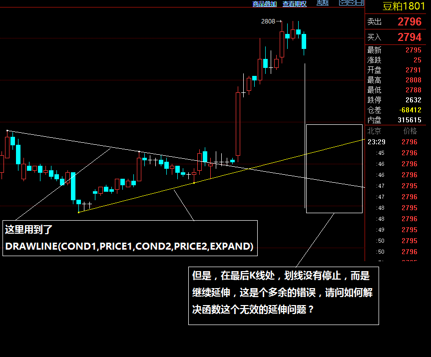 博易技术人员: 下图(附图)就是我们要询问的问题,函数DRAWLINE划线,应该截止到最后K线处停止,但,实际使用时却在K线图上继续无效延伸,能否解决不?无论是通达信还是文华,使用这个函数,都是停留在最后的K线处的。
