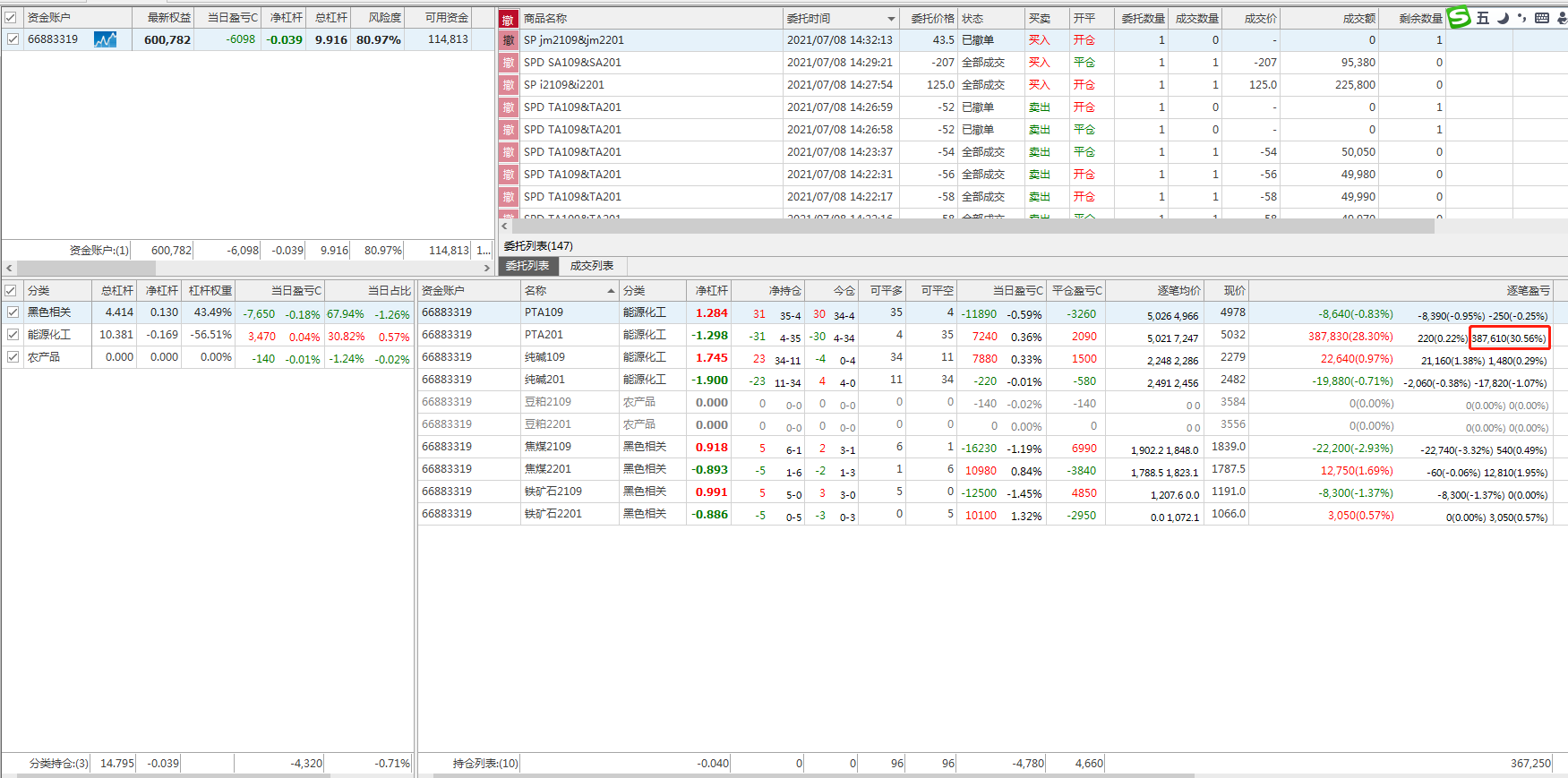 如图所示,TA201空单35手显示浮盈38.7万,昨天才建的仓.文华显示4000,在另一台电脑TB又显示为28.6万.请修正