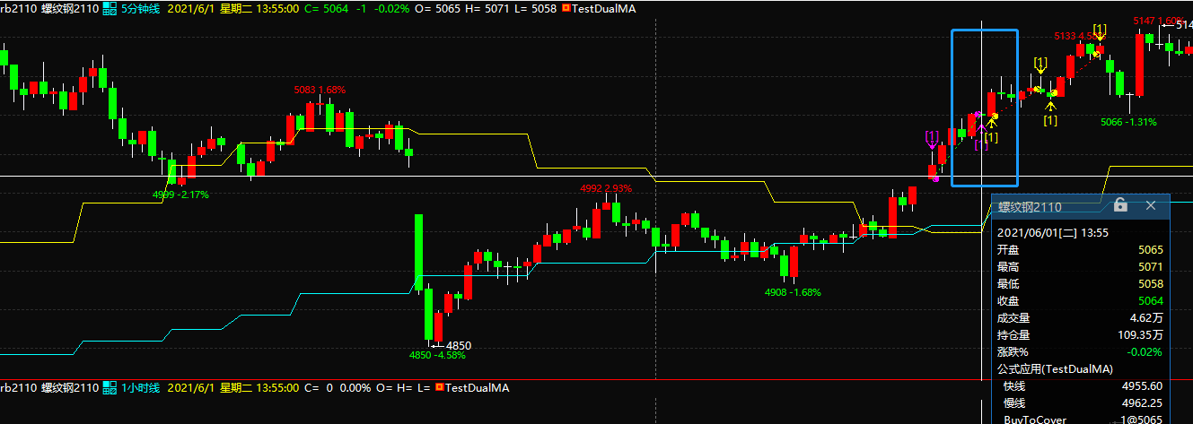 商品为rb2110,数据源0为5分钟周期,数据源1为1小时周期,在5分钟周期交易;1小时周期金叉开多、死叉开空。开空所在的1小时周期内如果出场则依旧以1小时周期的死叉条件进场,实测发现死叉若13:55出场,下一个1小时周期正好金叉,会发生闪烁;下面附图和策略代码