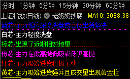DRAWGBK(C>0, RGB(0,0,00),RGB(0,0,0),0,'11',0);MA10:MA(CLOSE,10);MA60:MA(CLOSE,60);cxh6:=(( ABS((O-C))/(H-L))*V);cxh7:=(( (H-IF((C>O),C,O))/(H-L))*V);cxh8:=(( (IF((C>O),O,C)-L)/(H-L))*V);cxh9:=IF(((V/CAPITAL)>0.001),1,EXP(ABS(LOG(((V/CAPITAL)*100)))));加仓:cxh6>=cxh7 AND cxh6>=cxh8 AND C>O,NODRAW,COLORRED;减仓:cxh6>=cxh7 AND cxh6>=cxh8 AND C<O,NODRAW,COLORBLUE;洗盘:cxh8>cxh6 AND cxh8>cxh7,NODRAW,COLORWHITE;高抛:cxh7>cxh6 AND cxh7>cxh8,NODRAW,COLORMAGENTA;地量:cxh9>2 AND V<MA(V,5)/2,NODRAW,COLORGREEN;DRAWKLINE(HIGH,O,L,C);TY:=C;A1:=REF(TY,10)=HHV(TY,2*10+1); B1:=FILTER(A1,10); C1:=BACKSET(B1,10+1); HD:=FILTER(C1,10);A2:=REF(TY,10)=LLV(TY,2*10+1); B2:=FILTER(A2,10); C2:=BACKSET(B2,10+1); LD:=FILTER(C2,10);前期高位:REF(HIGH,BARSLAST(HD)), COLORFF00FF,POINTDOT,LINETHICK3;前期低位:REF(LOW,BARSLAST(LD)), COLORGREEN,POINTDOT,LINETHICK3;STICKLINE(加仓,O,C,1,0),COLORRED;STICKLINE(洗盘,O,C,1,0),COLORWHITE;STICKLINE(减仓,O,C,1,0),COLORBLUE;STICKLINE(高抛,O,C,1,0),COLORMAGENTA;STICKLINE(地量,O,C,1,0),COLORGREEN;JJ:=(3*C+HIGH+LOW+O)/6;cxh1:=(8*JJ+7*REF(JJ,1)+6*REF(JJ,2)+5*REF(JJ,3)+4*REF(JJ,4)+3*REF(JJ,5)+2*REF(JJ,6)+REF(JJ,8))/36;TJ1:=V=HHV(V,10) AND V>2*REF(V,1) AND C>cxh1 AND C>REF(CLOSE,1);LJL:=FILTER(TJ1,5);STICKLINE(C,REF(L,BARSLAST(LJL)),REF(L,BARSLAST(LJL)),1,0),COLORRED;STICKLINE(C,REF(C,BARSLAST(LJL)),REF(C,BARSLAST(LJL)),1,0),COLORYELLOW;STICKLINE(LJL,O,C,1,0),COLORYELLOW;DRAWTEXT_FIX(1,0.0,0.0,0,'蓝芯-主力低位深度洗盘或高位出货坚决'),COLORBLUE,LINETHICK1;DRAWTEXT_FIX(1,0.00,0.06,0,'白芯-主力轻度洗盘'),COLORWHITE,LINETHICK1;DRAWTEXT_FIX(1,0.00,0.12,0,'棕芯-出现了近期相对地量'),COLORGREEN,LINETHICK1;DRAWTEXT_FIX(1,0.00,0.18,0,'粉芯-主力在做高抛低吸或低吸高抛'),COLORFF00FF,LINETHICK1;DRAWTEXT_FIX(1,0.00,0.24,0,'红芯-主力吸筹进货积极主动'),COLORRED,LINETHICK1;DRAWTEXT_FIX(1,0.00,0.3,0,'黄芯-主力吸筹进货强并且成交量出现黄金柱'),COLORYELLOW,LINETHICK1;DRAWTEXT_FIX(C>0,0.004,1,0,DYBLOCK),COLORYELLOW,LINETHICK2;DRAWTEXT_FIX(C>0,0.06,1,0,HYBLOCK),COLORRED,LINETHICK2;DRAWTEXT_FIX(C>0,0.12,1,0,EXTERNSTR(0,1)),COLORWHITE,LINETHICK2;EN1:=ZIG(3,5)>REF(ZIG(3,5),1) AND REF(ZIG(3,5),1)<=REF(ZIG(3,5),2) AND REF(ZIG(3,5),2)<=REF(ZIG(3,5),3);PL10:=ZIG(3,10);走强2:=BARSLAST(PL10<REF(PL10,1));ZTJZ5:=IF(PL10>REF(PL10,1),COUNT(EN1,走强2),0);追2:=EN1 AND PL10>REF(PL10,1) AND ZTJZ5=2;追4:=EN1 AND PL10>REF(PL10,1) AND ZTJZ5=3;DRAWTEXT(追2 OR 追4,L*0.978,'追'),COLORYELLOW;PL5:=ZIG(3,5);EX1:=ZIG(3,5)<REF(ZIG(3,5),1) AND REF(ZIG(3,5),1)>=REF(ZIG(3,5),2) AND REF(ZIG(3,5),2)>=REF(ZIG(3,5),3);EN2:=ZIG(3,10)>REF(ZIG(3,10),1) AND REF(ZIG(3,10),1)<=REF(ZIG(3,10),2) AND REF(ZIG(3,10),2)<=REF(ZIG(3,10),3);EX2:=ZIG(3,10)<REF(ZIG(3,10),1) AND REF(ZIG(3,10),1)>=REF(ZIG(3,10),2) AND REF(ZIG(3,10),2)>=REF(ZIG(3,10),3);PL20:=ZIG(3,20);EN3:=ZIG(3,20)>REF(ZIG(3,20),1) AND REF(ZIG(3,20),1)<=REF(ZIG(3,20),2) AND REF(ZIG(3,20),2)<=REF(ZIG(3,20),3);EX3:=ZIG(3,20)<REF(ZIG(3,20),1) AND REF(ZIG(3,20),1)>=REF(ZIG(3,20),2) AND REF(ZIG(3,20),2)>=REF(ZIG(3,20),3);PL40:=ZIG(3,40);走强1:=BARSLAST(PL5<REF(PL5,1));走弱1:=BARSLAST(PL5>REF(PL5,1));走弱2:=BARSLAST(PL10>REF(PL10,1));走强3:=BARSLAST(PL20<REF(PL20,1));走弱3:=BARSLAST(PL20>REF(PL20,1));{ZTJZ5:=IF(PL10>REF(PL10,1),COUNT(EN1,走强2),0);}ZTJD5:=IF(PL10>REF(PL10,1),COUNT(EX1,走强2),0);DTJZ5:=IF(PL10<REF(PL10,1),COUNT(EN1,走弱2),0);DTJD5:=IF(PL10<REF(PL10,1),COUNT(EX1,走弱2),0);ZTJZ10:=IF(PL20>REF(PL20,1),COUNT(EN2,走强3),0);ZTJD10:=IF(PL20>REF(PL20,1),COUNT(EX2,走强3),0);DTJZ10:=IF(PL20<REF(PL20,1),COUNT(EN2,走弱3),0);DTJD10:=IF(PL20<REF(PL20,1),COUNT(EX2,走弱3),0);DRAWTEXT(EN1 AND DTJZ5=1,L*0.98,'反弹低点'),COLORLIRED;DRAWTEXT(EX1 AND DTJD5=2,H*1.02,'反弹高点!'),COLORLIBLUE;DRAWTEXT(EN2 AND ZTJZ5=1,L*0.98,'底'),COLORYELLOW;DRAWTEXT(EX1 AND PL10>REF(PL10,1) AND ZTJD5=1,H*1.02,'减仓'),COLORFFFF00;DRAWTEXT(EN1 AND PL10>REF(PL10,1) AND ZTJZ5=2,L*0.98,'----买'),COLOR0000FF;DRAWTEXT(EX1 AND PL10>REF(PL10,1) AND ZTJZ5=2,H*1.02,'短卖'),COLORGREEN;DRAWTEXT(EN1 AND PL10>REF(PL10,1) AND ZTJZ5=3,L*0.98,'----短买'),COLOR0000FF;DRAWTEXT(EX2 AND PL20>REF(PL20,1) AND ZTJD10=1,H*1.02,'短卖'),COLORGREEN;DRAWTEXT(EN2 AND DTJZ10=1,L*0.96,'Ⅰ'),COLORFF00FF;DRAWTEXT(EX2 AND DTJD10=2,H*1.03,'Ⅱ'),COLORFF6000;DRAWTEXT(EN3 AND ZTJZ10=1,L*0.95,'Ⅲ'),COLORYELLOW;DRAWTEXT(EX2 AND PL20>REF(PL20,1) AND ZTJD10=1,H*1.06,'①'),LINETHICK3,COLORFFFF00;DRAWTEXT(EN2 AND PL20>REF(PL20,1) AND ZTJZ10=2,L*0.96,'②'),LINETHICK3,COLORYELLOW;DRAWTEXT(EX2 AND PL20>REF(PL20,1) AND ZTJD10=2 OR (ZTJD10=0 OR ZTJD10=2) AND EX2,H*1.02,'清仓!'),LINETHICK3,COLORWHITE;DRAWTEXT(EN2 AND PL20>REF(PL20,1) AND ZTJZ10=3,L*0.96,'④'),LINETHICK3,COLORYELLOW;DRAWTEXT(EN1 AND PL10>REF(PL10,1) AND ZTJZ5=3,L*0.95,'⑷'),COLORYELLOW;EMA13:=EMA(CLOSE,13);EMA34:=EMA(CLOSE,34);EMA55:=EMA(CLOSE,55);EMA120:=EMA(CLOSE,120);CR1:=(CLOSE-REF(CLOSE,1))/REF(CLOSE,1)*100>0.5;CR2:=V>MA(VOL,5)*0.6;CR3:=COUNT(CROSS(EMA13,EMA55),3)=1;CR4:=ABS(EMA34-EMA55)/EMA55<0.03;CR5:=EMA55<=EMA120 AND EMA55>=REF(EMA55,1);CR6:=FILTER(CR1 AND CR2 AND CR3 AND CR4 AND CR5,2);DRAWTEXT(CR6,C*0.98,'风险'),COLORWHITE;{程序化交易 www.cxh99.com }