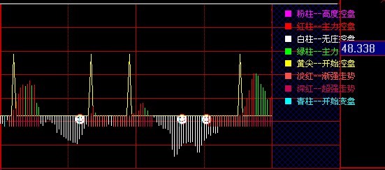① 粉柱、红柱、白柱、绿柱和黄尖:用于表示市场控盘情况的符号。