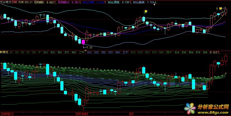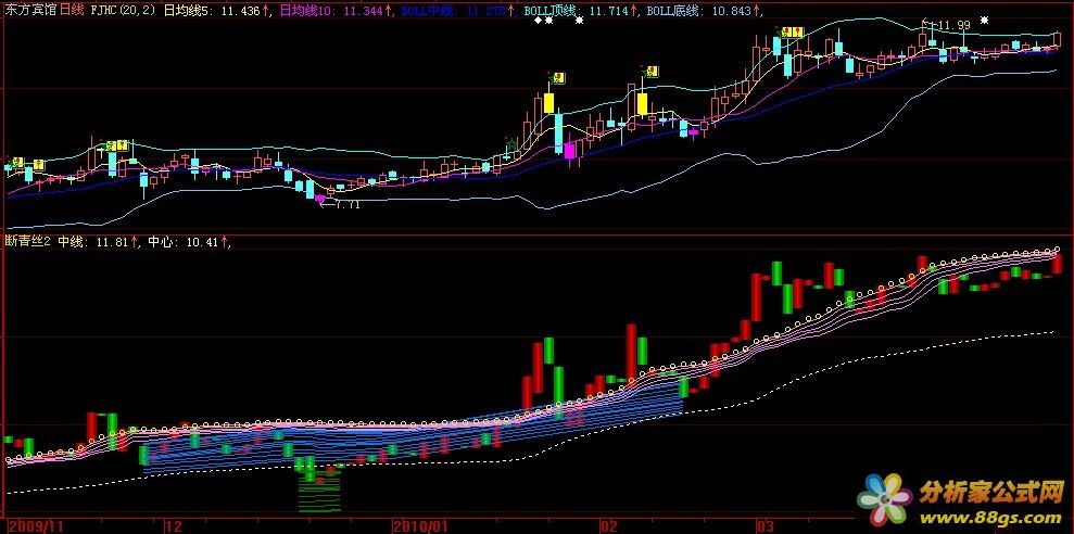 计算并绘制股票的中线和中心线。其中,中线使用COST函数计算得出,采用向上偏移(x1.06),以不同粗细和颜色的圆形点线表示;中心线则使用EMA函数计算得出,以不同颜色的点线表示。