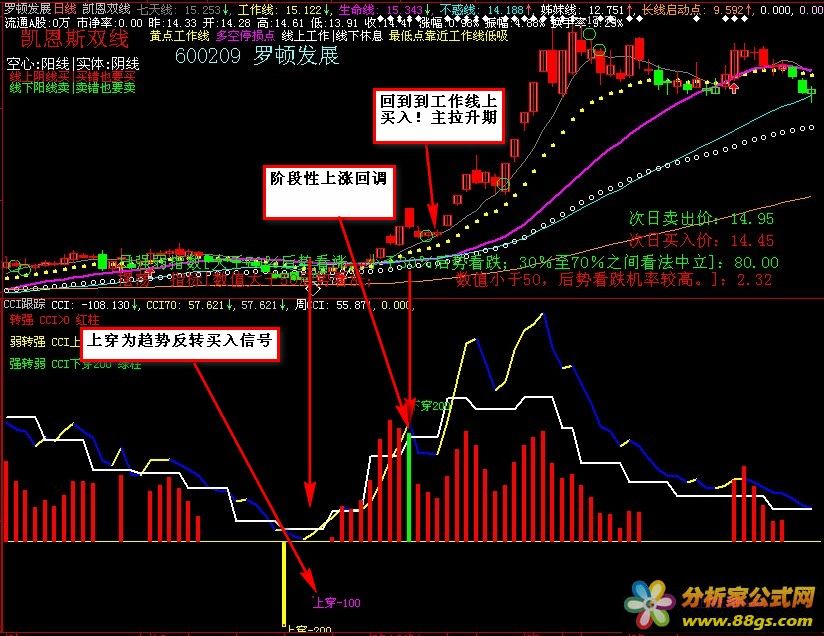 当CCI上穿-200且CCI大于前一天的CCI时,在图表中以黄色柱状线表示。