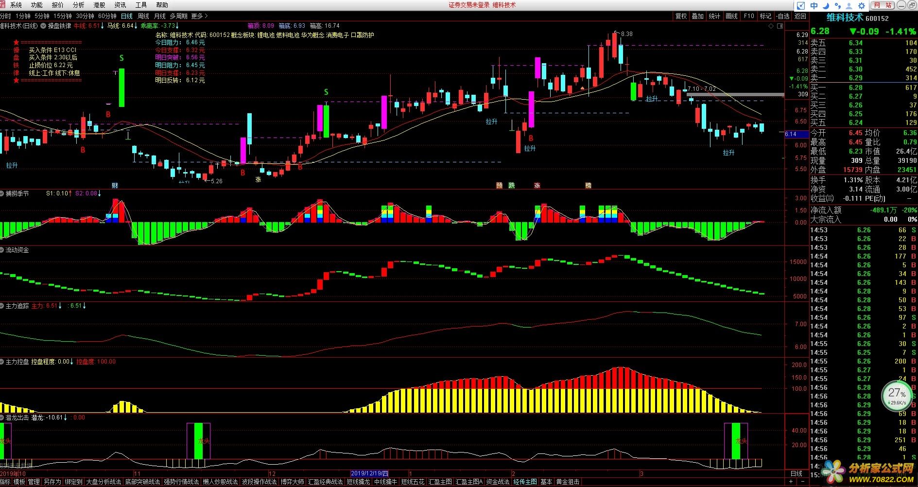 MID:=(3*CLOSE+LOW+OPEN+HIGH)/6;牛线:(20*MID+19*REF(MID,1)+18*REF(MID,2)+17*REF(MID,3)+16*REF(MID,4)+15*REF(MID,5)+14*REF(MID,6)+13*REF(MID,7)+12*REF(MID,8)+11*REF(MID,9)+10*REF(MID,10)+9*REF(MID,11)+8*REF(MID,12)+7*REF(MID,13)+6*REF(MID,14)+5*REF(MID,15)+4*REF(MID,16)+3*REF(MID,17)+2*REF(MID,18)+REF(MID,20))/210,COLORRED;马线:MA(牛线,6),COLORYELLOW;乖离率:(C-牛线)/C*100,NODRAW,COLORGREEN;涨停:=IF((C-REF(C,1))/REF(C,1)>0.097,1,0);STICKLINE(涨停,OPEN,CLOSE,3,0),COLORMAGENTA;跌停:=IF((REF(C,1)-C)/C>0.097,1,0);STICKLINE(跌停,OPEN,CLOSE,3,0),COLORGREEN;KP:=SMA(AMOUNT,10,1)/10000;cxh11:=REF(KP,1);cxh21:=REF(KP,2);cxh31:=REF(KP,3);涨停复制:=C>=(牛线,牛线) AND 牛线>(马线,马线) AND乖离率>=(0,0) AND 乖离率<=(4,4)AND COUNT(KP>cxh11,1)AND cxh11>cxh21 AND cxh21>cxh31 ANDCOUNT(((CLOSE-REF(CLOSE,1))/REF(CLOSE,1))>0.099,13)>=1;DRAWTEXT(涨停复制,L*0.95,'涨'),COLOR00FFFF;DRAWTEXT(涨停复制,L*0.91,'停'),COLOR00FFFF;DRAWTEXT(涨停复制,L*0.87,'复'),COLOR00FFFF;DRAWTEXT(涨停复制,L*0.83,'制'),COLOR00FFFF;cxh0:=SMA(MAX(CLOSE-REF(C,1),0),12,1)/SMA(ABS(CLOSE-REF(C,1)),15,1)*100;DRAWTEXT(CROSS(82,cxh0),H*1.04,'快卖'),COLORWHITE;S:=C-REF(C,1);DX:=100*EMA(EMA(S,6),6)/EMA(EMA(ABS(S),6),6);买:=IF(LLV(DX,2)=LLV(DX,7) AND COUNT(DX<0,2) AND CROSS(DX,MA(DX,2)),1,0);DRAWTEXT(FILTER(买=1,5),L*0.96,'拉升'),COLORFFDE00;DA:=(EMA(C,1)+EMA(C,2)+EMA(C,3)+EMA(C,4))/4;DB:=(EMA(C,10)+EMA(C,20)+EMA(C,40)+EMA(C,80))/4;DRAWICON(CROSS(DA-DB,0),L*0.98,7);JH:=SMA(MAX(C-REF(C,1),0),5,1)/SMA(ABS(C-REF(C,1)),5,1)*100;DRAWICON(CROSS(84,JH),H*1.04,8);字:=STRCAT(STRCAT(STRCAT(STRCAT('名称: ',STKNAME),' 代码: '),CODE),' ' );板块:=STRCAT('概念板块: ',GNBLOCK);DRAWTEXT_FIX(ISLASTBAR,0.2,0,0,STRCAT(字,板块)),COLORYELLOW;YC:=REF(CLOSE,1);止损价位:=(YC*1.0035*97+0.2)/99.65;DRAWTEXT_FIX(C!=0,0.02,0.05,0,' =================='),COLORRED;DRAWTEXT_FIX(C!=0,0.02,0.1,0,'操 '),COLORRED;DRAWTEXT_FIX(C!=0,0.02,0.15,0,'盘 '),COLORRED;DRAWTEXT_FIX(C!=0,0.02,0.2,0,'铁 '),COLORRED;DRAWTEXT_FIX(C!=0,0.02,0.25,0,'律 '),COLORRED;DRAWTEXT_FIX(C!=0,0.02,0.3,0,' =================='),COLORRED;DRAWTEXT_FIX(C!=0,0.04,0.1,0,'买入条件 E13 CCI'),COLORYELLOW;DRAWTEXT_FIX(C!=0,0.04,0.15,0,'买入条件 2:30以后'),COLORYELLOW;DRAWTEXT_FIX(C!=0,0.04,0.2,0,STRCAT('止损价位 ',STRCAT(CON2STR(止损价位,2),' 元'))),COLORYELLOW;DRAWTEXT_FIX(C!=0,0.04,0.25,0,'线上:工作 线下:休息'),COLORYELLOW;E:=(HIGH+LOW+OPEN+2*CLOSE)/5;明日阻力:=2*E-LOW;明日支撑:=2*E-HIGH;明日突破:=E+(HIGH-LOW);明日反转:=E-(HIGH-LOW);今日阻力:=REF(明日阻力 , 1);今日支撑:=REF(明日支撑 , 1);DRAWTEXT_FIX(C!=0,0.2,0.05,0,STRCAT('今日阻力: ',STRCAT(CON2STR(今日阻力,2),' 元'))),COLORFFFF00;DRAWTEXT_FIX(C!=0,0.2,0.1,0,STRCAT('今日支撑: ',STRCAT(CON2STR(今日支撑,2),' 元'))),COLORRED;DRAWTEXT_FIX(C!=0,0.2,0.15,0,STRCAT('明日突破: ',STRCAT(CON2STR(明日突破,2),' 元'))),COLORFF00FF;DRAWTEXT_FIX(C!=0,0.2,0.2,0,STRCAT('明日阻力: ',STRCAT(CON2STR(明日阻力,2),' 元'))),COLORFFFF00;DRAWTEXT_FIX(C!=0,0.2,0.25,0,STRCAT('明日支撑: ',STRCAT(CON2STR(明日支撑,2),' 元'))),COLORRED;DRAWTEXT_FIX(C!=0,0.2,0.3,0,STRCAT('明日反转: ',STRCAT(CON2STR(明日反转,2),' 元'))),COLORYELLOW;A:=HHV(HIGH,13)=HIGH AND HIGH>REF(HIGH,1);A1:=FILTER(A,12);B:=LLV(LOW,13)=LOW AND LOW<REF(LOW,1);B1:=FILTER(B,12);TS1:=BARSLAST(A1);箱顶:REF(HIGH,TS1),COLORFF00FF,NODRAW;STICKLINE(1,箱顶,箱顶,1.5,0),COLORFF00FF;TS2:=BARSLAST(B1);箱底:REF(LOW,TS2),COLORFFBB80,NODRAW;STICKLINE(1,箱底,箱底,1.5,0),COLORFFBB80;箱高:100*(箱顶-箱底)/箱底,NODRAW;均价:=(3*C+H+L+O)/6;cxh1:=(8*均价+7*REF(均价,1)+6*REF(均价,2)+5*REF(均价,3)+4*REF(均价,4)+3*REF(均价,5)+2*REF(均价,6)+REF(均价,8))/36;cxh2:=(LLV(cxh1,2)+LLV(cxh1,4)+LLV(cxh1,6))/3;SZ1:=REF(cxh1,1)=REF(cxh2,1) AND cxh1>cxh2 AND CLOSE>cxh1;SZ2:=cxh1>cxh2 AND cxh1>REF(cxh1,1) AND cxh2>REF(cxh2,1)AND H/cxh1<1.1 AND L>cxh2 AND CLOSE>cxh1;SZ3:=cxh1>cxh2 AND cxh1>REF(cxh1,1) AND cxh2>=REF(cxh2,1) AND H/cxh1>1.1;SZ4:=cxh1>cxh2 AND cxh1>REF(cxh1,1) AND cxh2>REF(cxh2,1)AND CLOSE>cxh2 AND CLOSE<cxh1;SZ5:=(cxh1>cxh2 AND cxh2>REF(cxh2,1) AND cxh1<>REF(cxh1,1)AND CLOSE<cxh2) OR (cxh1>cxh2 AND cxh1<REF(cxh1,1)AND cxh2<REF(cxh2,1) AND CLOSE<cxh2);SZ6:=REF(cxh1,1)>REF(cxh2,1) AND cxh1=cxh2 AND CLOSE<cxh2;XD1:=cxh1=cxh2 AND CLOSE<cxh2 OR (cxh1<REF(cxh1,1) AND cxh2<REF(cxh2,1)AND REF(cxh1,1)=REF(cxh2,1) AND CLOSE<cxh2);XD2:=cxh1=cxh2 AND CLOSE>cxh1;SAT:=(AMOUNT/C)/(HHV(AMOUNT,20)/HHV(C,20));量能饱和度:=IF(SAT>1,1,SAT)*100;DRAWTEXT_FIX(BARSTATUS=2 AND SZ1,0.8,0.05,0,'调整结束短线介入'),COLORRED;DRAWTEXT_FIX(BARSTATUS=2 AND SZ2,0.8,0.05,0,'上升通道走势良好'),COLORRED;DRAWTEXT_FIX(BARSTATUS=2 AND SZ3,0.8,0.05,0,'股价偏离注意调整'),COLORRED;DRAWTEXT_FIX(BARSTATUS=2 AND SZ4,0.8,0.05,0,'上升通道调整洗盘'),COLORGREEN;{程序化交易 www.cxh99.com }