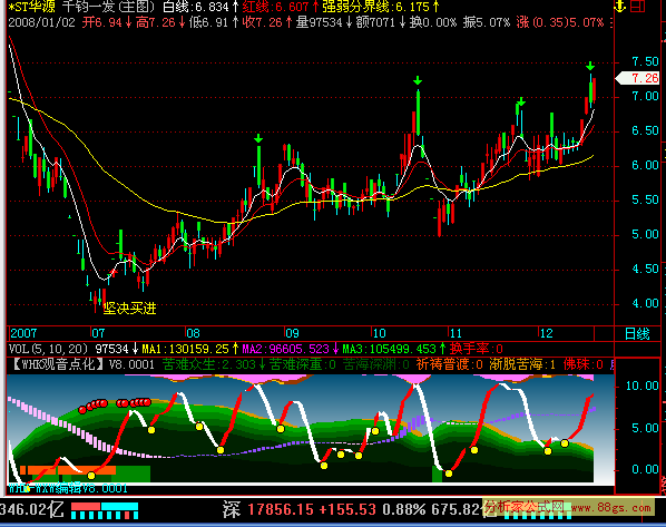 八、"福缘"与"缘尽"线为短线波动线.是本指标最重要的一根操作指导线."福缘"线在0线开始出现时,个股上涨启动有较大的可靠性,可介入."观音指点"可用作选股.