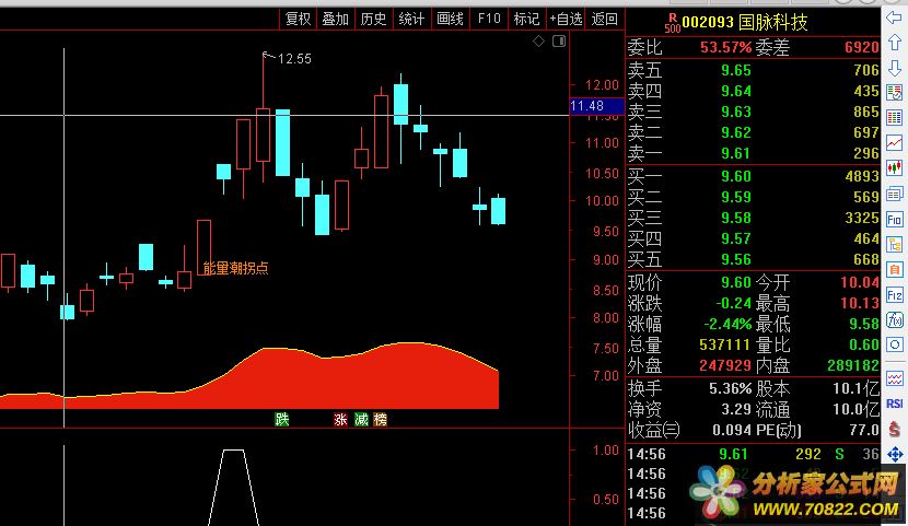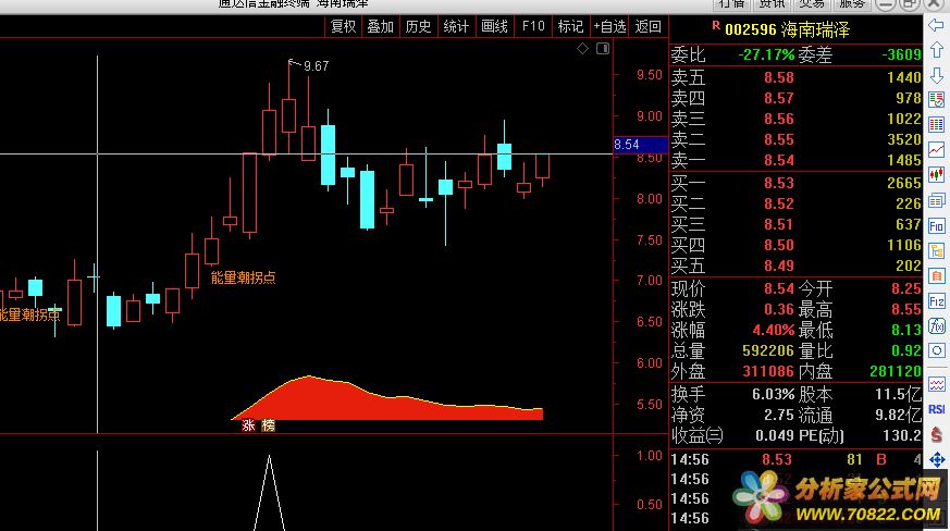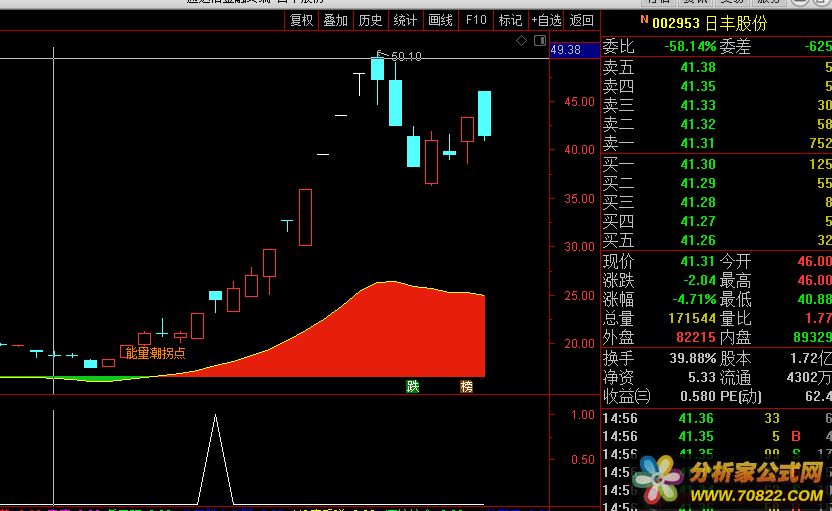 5. 压力线:根据最近9个交易日的收盘价计算得出,压力线的值为这个移动平均值乘以1.14后的指数移动平均线。压力线可以作为股价上涨的阻力水平,当股价突破压力线时,有可能继续上涨。