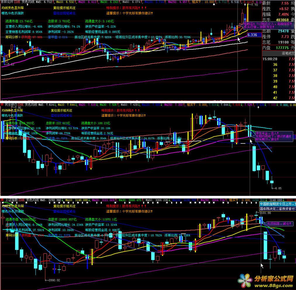 5、均线设置采用通用参数,本次升级加入了250日均线。除250均线外,其它均线皆变色,暖色冷色显示涨跌。