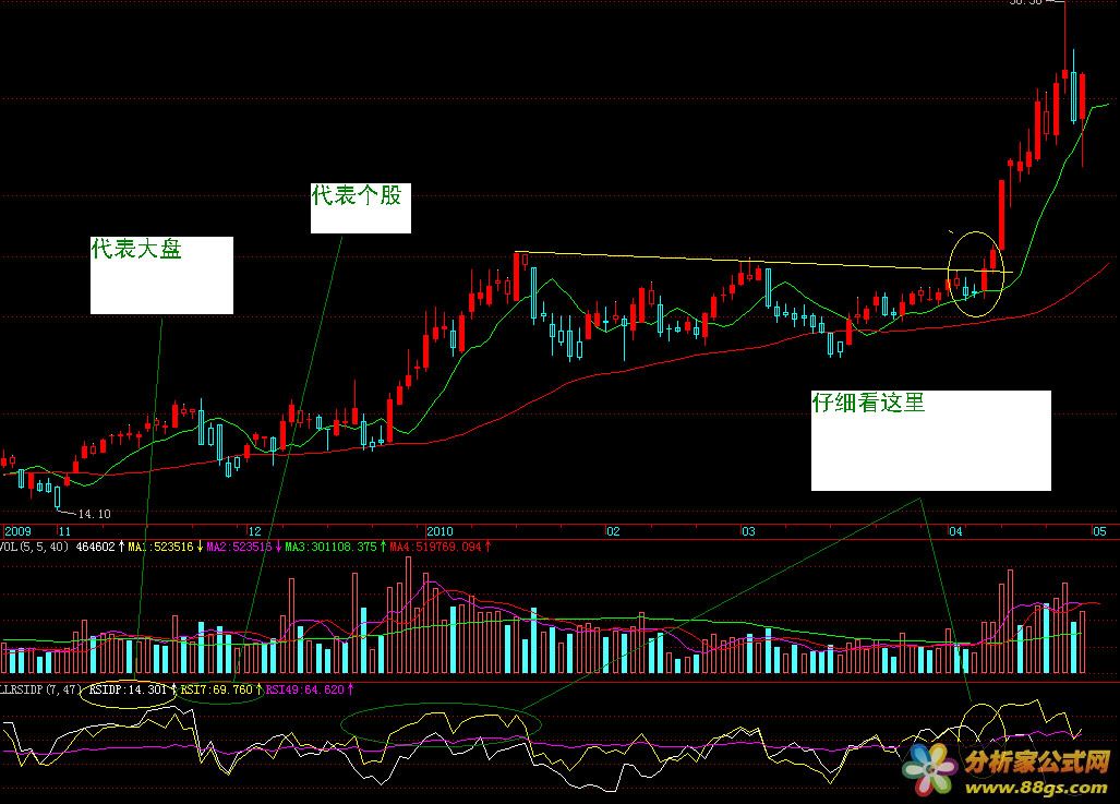 这个指标使用了参数N2,计算出较长时间内的收盘价上涨幅度的平均值与总幅度的平均值的比率,再乘以100得到RSI49值。RSI49可以反映出市场的中长期涨势情况。