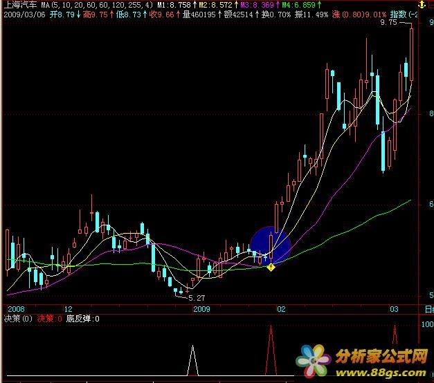 DRAWICON(KK AND MM,L*0.99,3);{决策线上行中,20日也在上行中}
