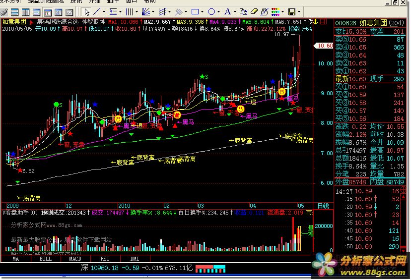 3. 买卖点提示:根据EMA指标、底背离、吸和黑马等信号,可判断股票的买入或卖出时机。建议关注底背离信号、吸的出现和黑马的形成,可作为买入信号;而出现底背离信号和黑马出现消失,可作为卖出信号。