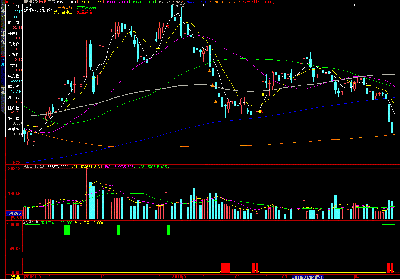 - 当抄底准备出现(黄色线段)时,可以考虑适当增加仓位或进行适度买入操作,以抓住市场的反弹或转强机会。