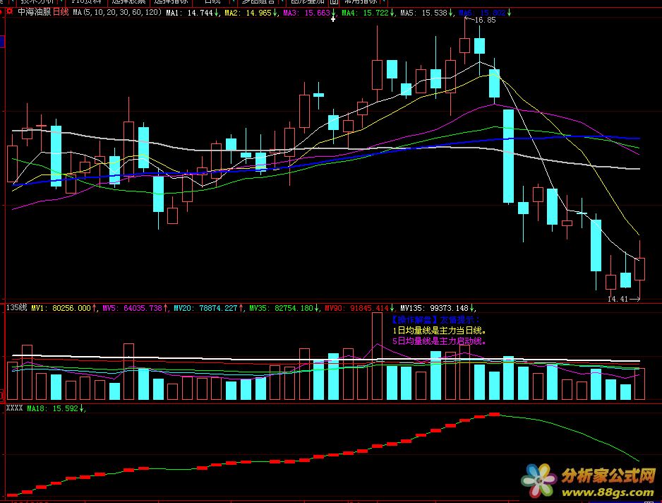 1. MA18指标:该指标计算了收盘价的18日移动平均线(MA18),并将其以绿色表示。移动平均线可以用来观察长期趋势,并判断股票价格的走势。