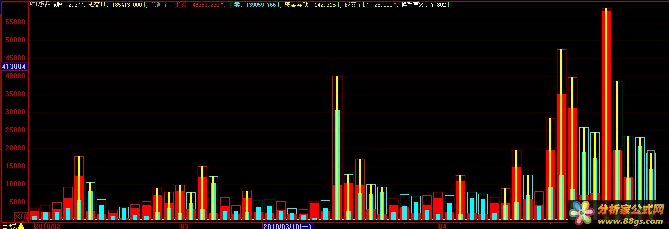 STICKLINE(C>=REF(C,1) ,0,VOL,8.2,1),COLORRED;
