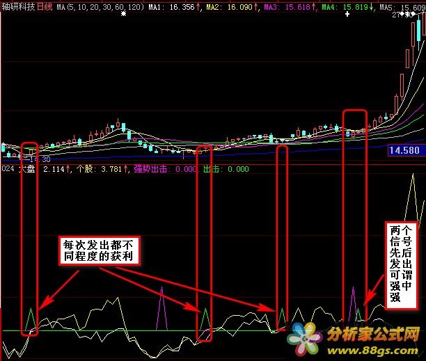 - "出击"部分:当个股相对强度指数超过0时,标记该点为出击。在柱状图中以5表示,可帮助投资者辨别哪些个股具有出击买进的趋势。