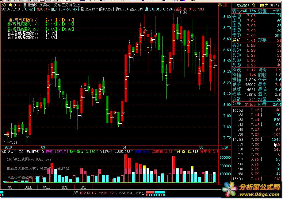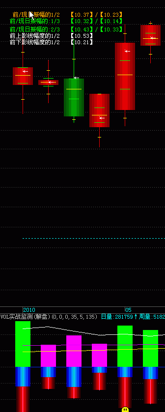 这是一种量价及心态买卖模式{振幅的二分之一加上实体的二分之一除以二同理三分之一和三分之二}还有上下影线的二分之一及均价。